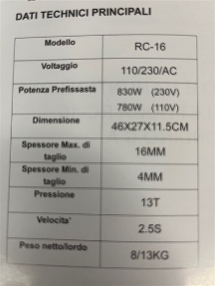 Motore Elettrico 230 volt Frequenza 50/60 Tensione 100/115/230 Potenza (W) 690 Diametro min di taglio (mm) 4 Diametro max di taglio (mm) 16 Resistenza di rottura a trazione tondino (N/mm2) 650 Velocità di taglio (sec) 2,2 - 3 Peso (kg) 9 Dimensioni (cm) 46*27*11.5